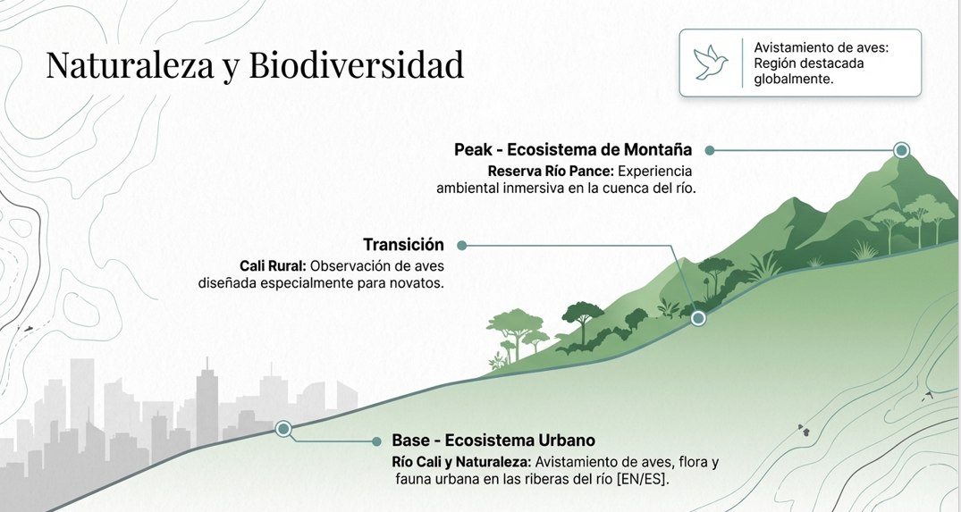 El recorrido inicia en el corazón de la ciudad, integrando la naturaleza con el entorno humano. El producto Río Cali y Naturaleza destaca la importancia de las riberas como corredores biológicos, ofreciendo avistamiento de aves y reconocimiento de flora urbana en una modalidad bilingüe [EN/ES], ideal para conectar a residentes y visitantes con su entorno inmediato.