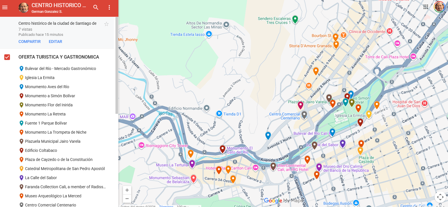 Hemos señalado algunos sitios de interes que se encuentran en la zona del centro historico de Cali, en especial sobre las riberas del río cali.